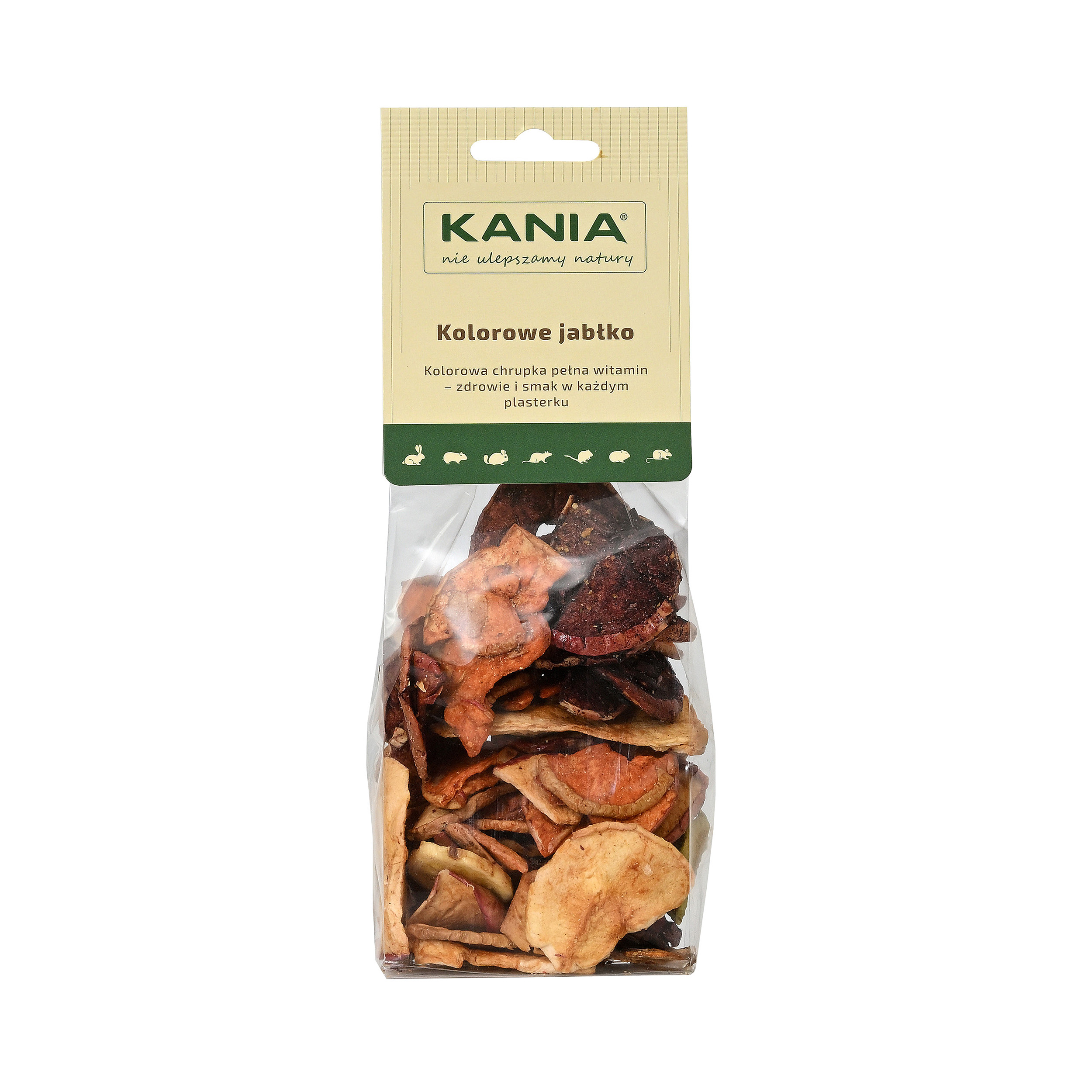Kolorowe jabłko to zdrowa i apetyczna karma uzupełniająca stworzona z naturalnych plasterków jabłka, barwionych wyłącznie naturalnymi barwnikami. Idealna jako przysmak lub urozmaicenie codziennej diety.